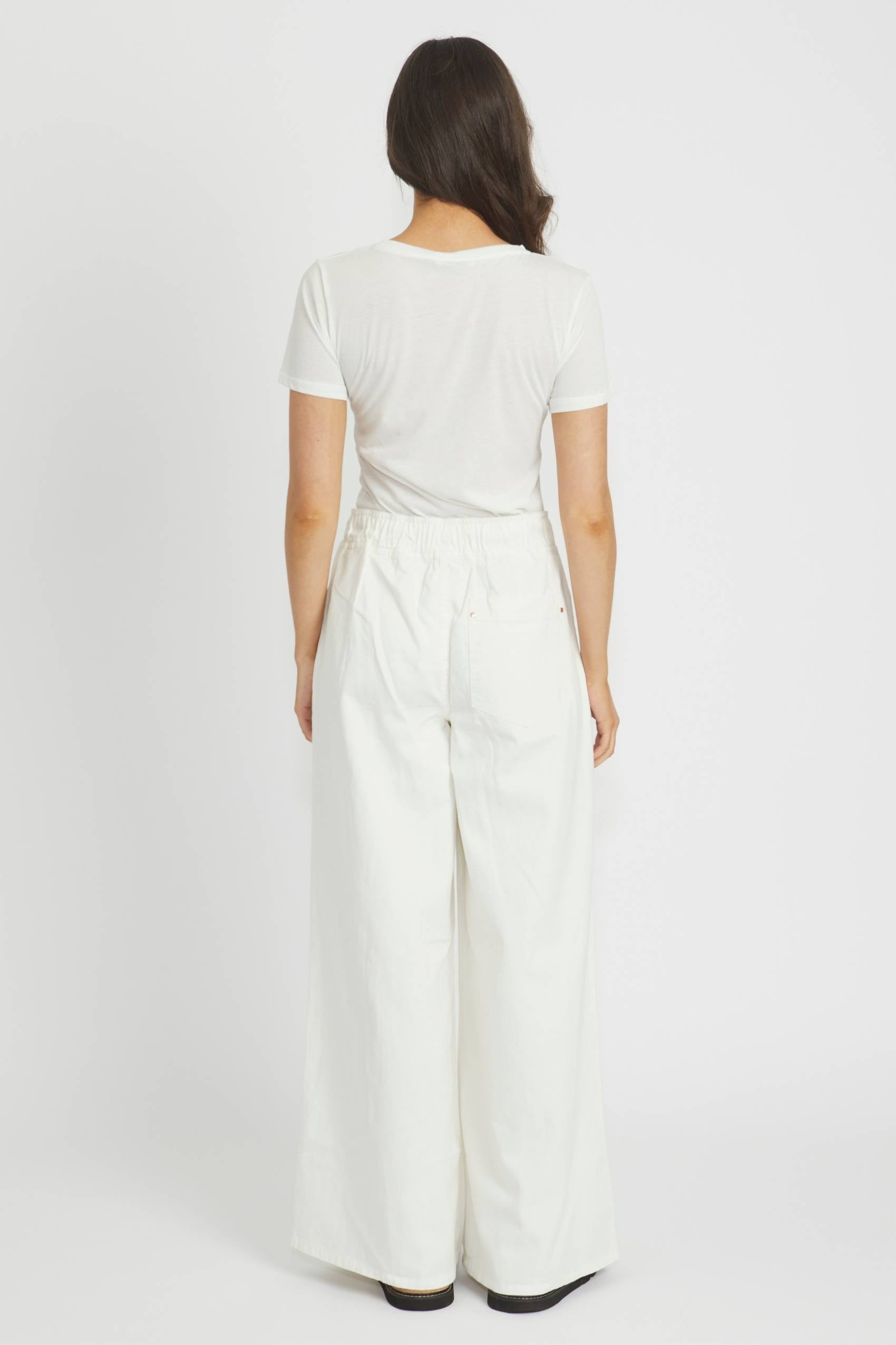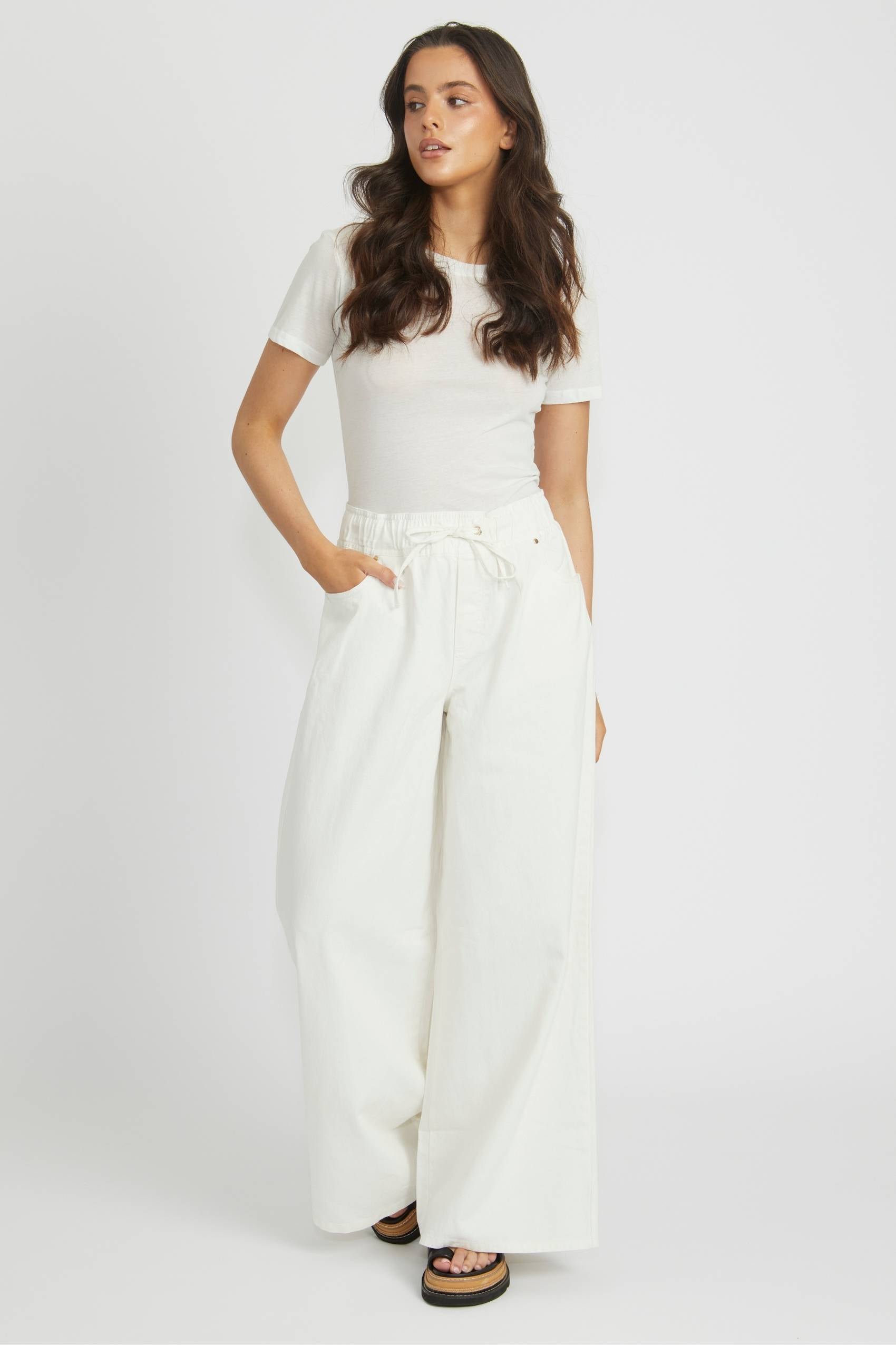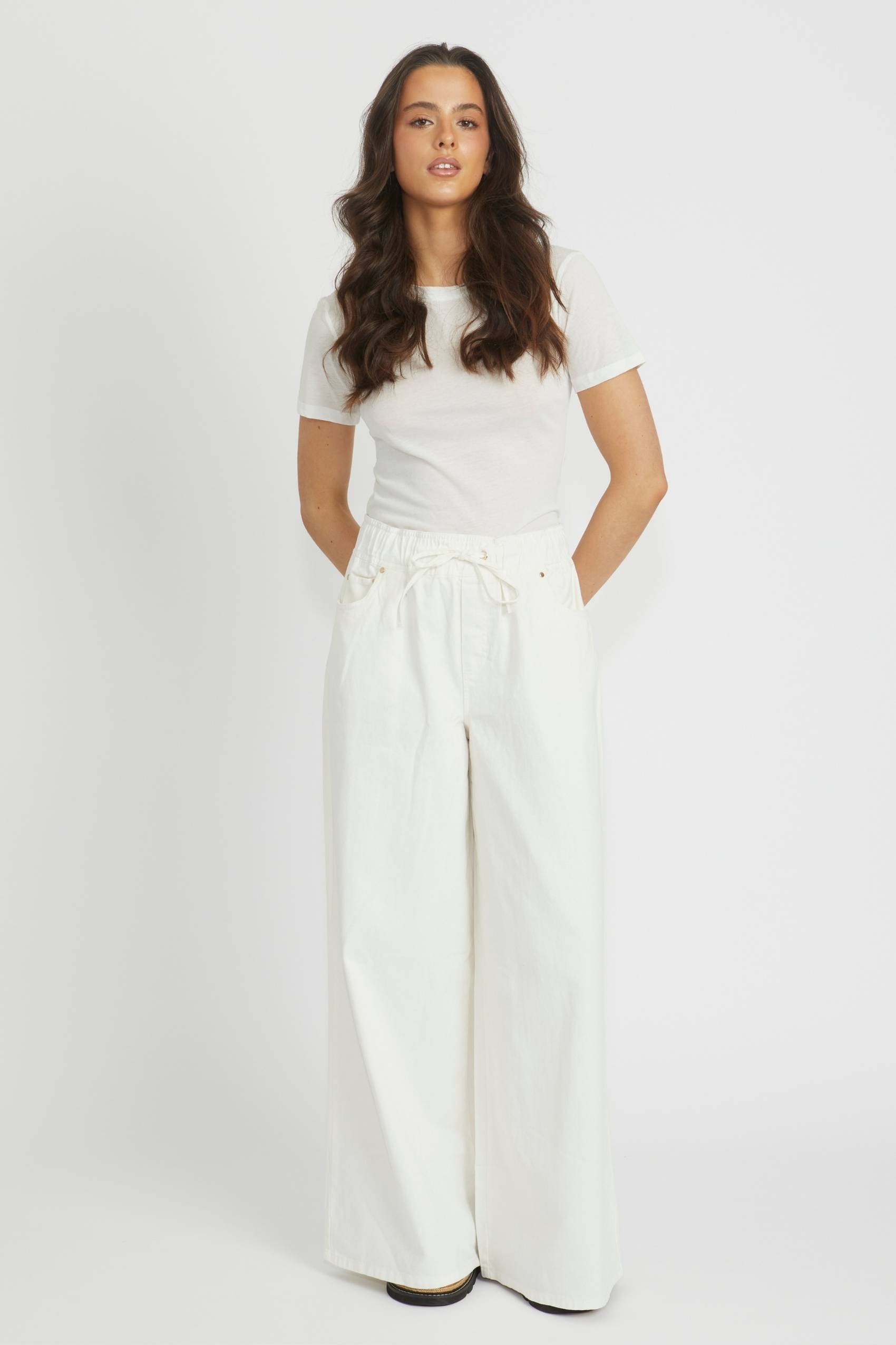 Wide-leg jeans designed with a comfortable mid-rise waist. The Cleo Jean falls fluidly to the ankle, creating a contemporary silhouette that works well with fitted or loose tops.