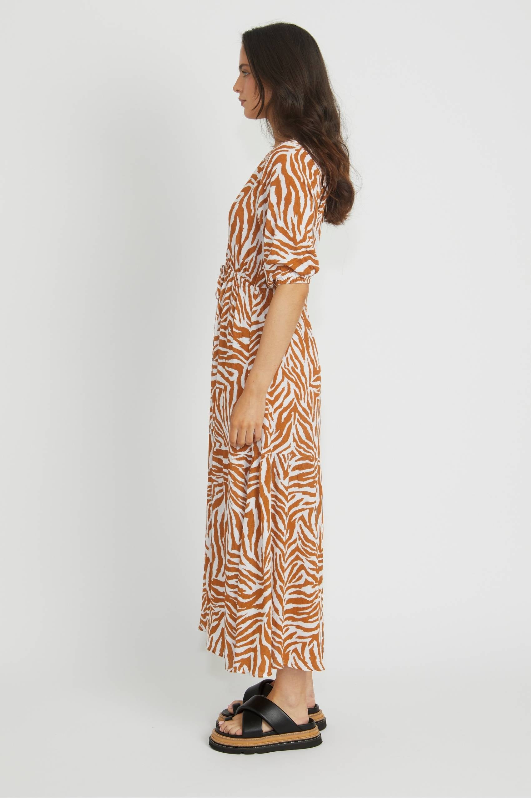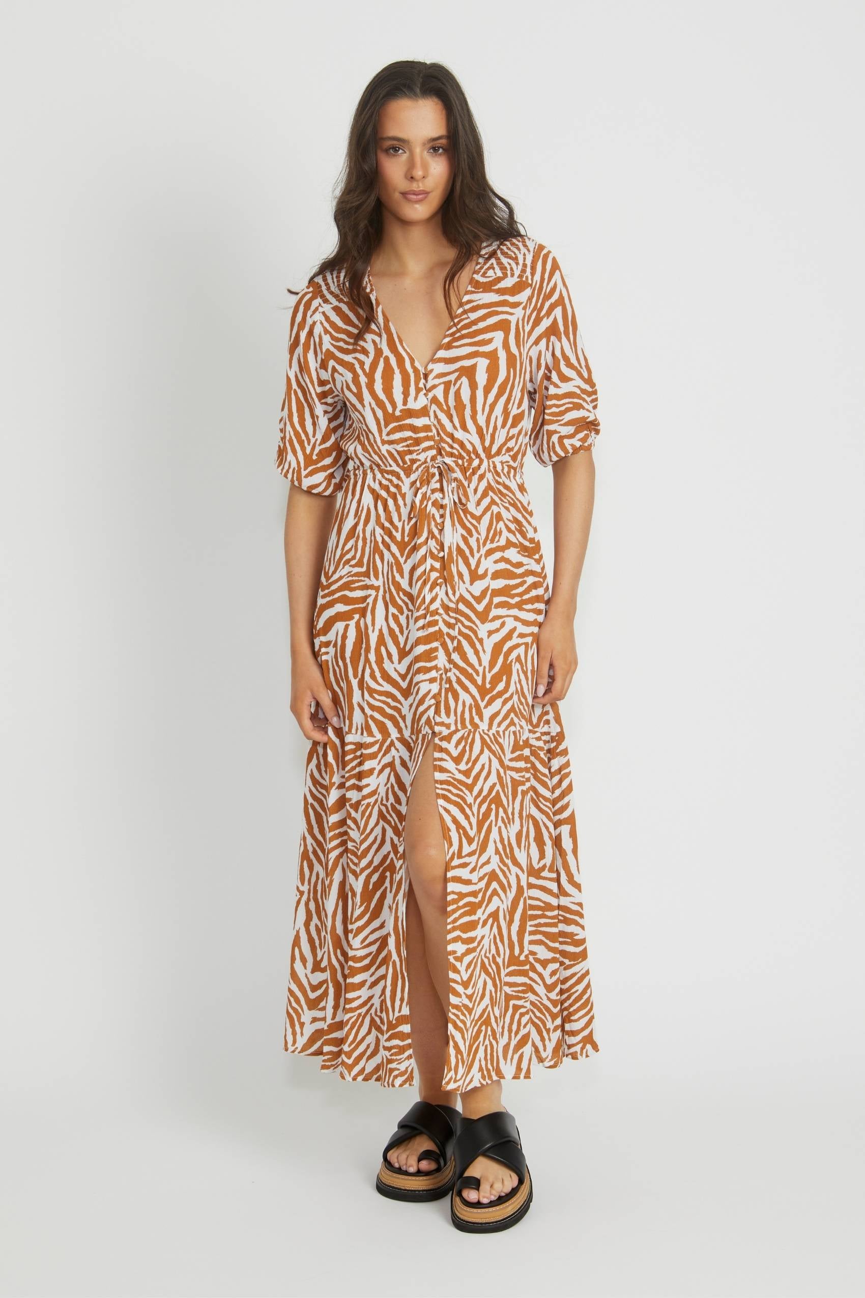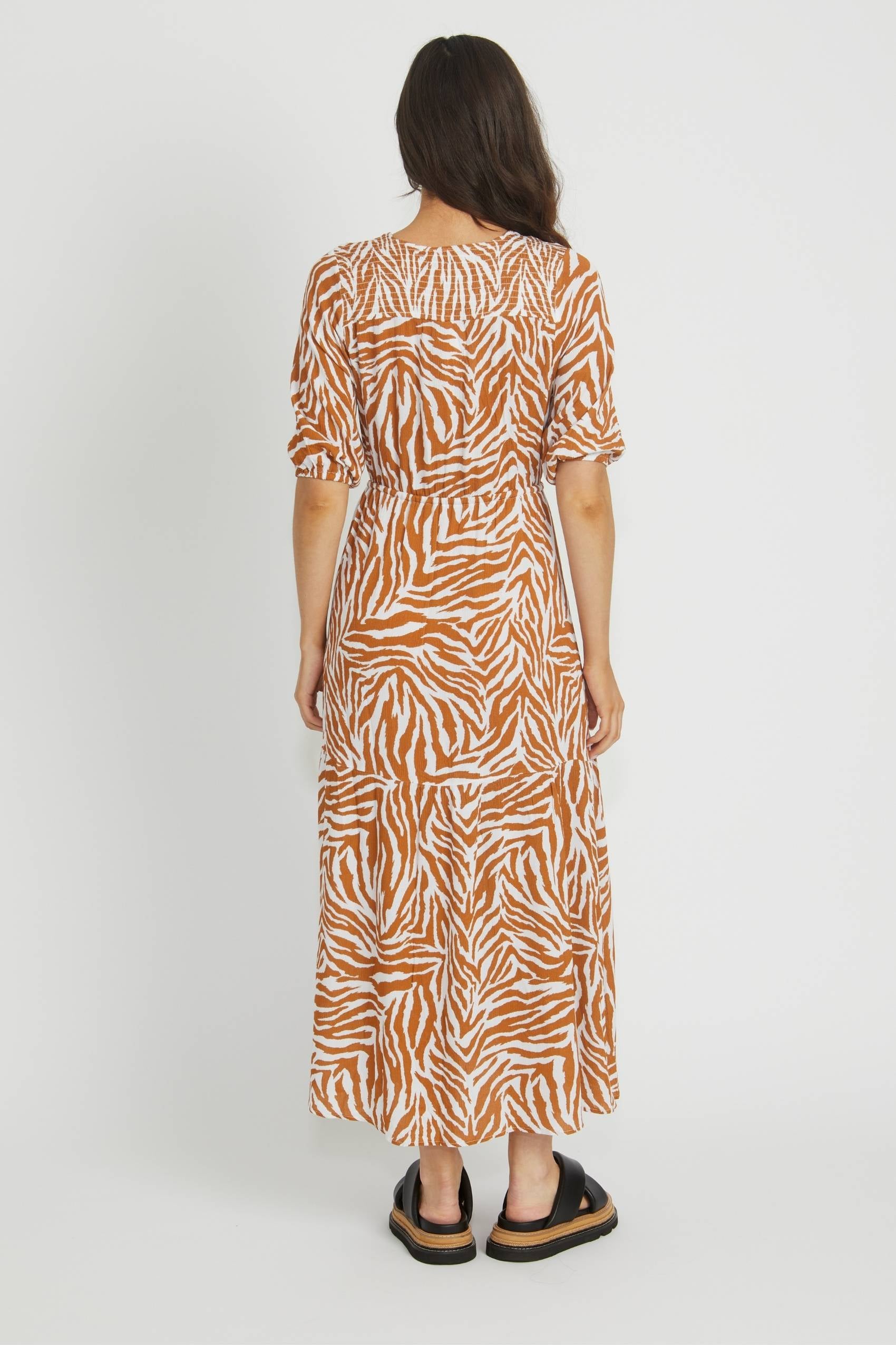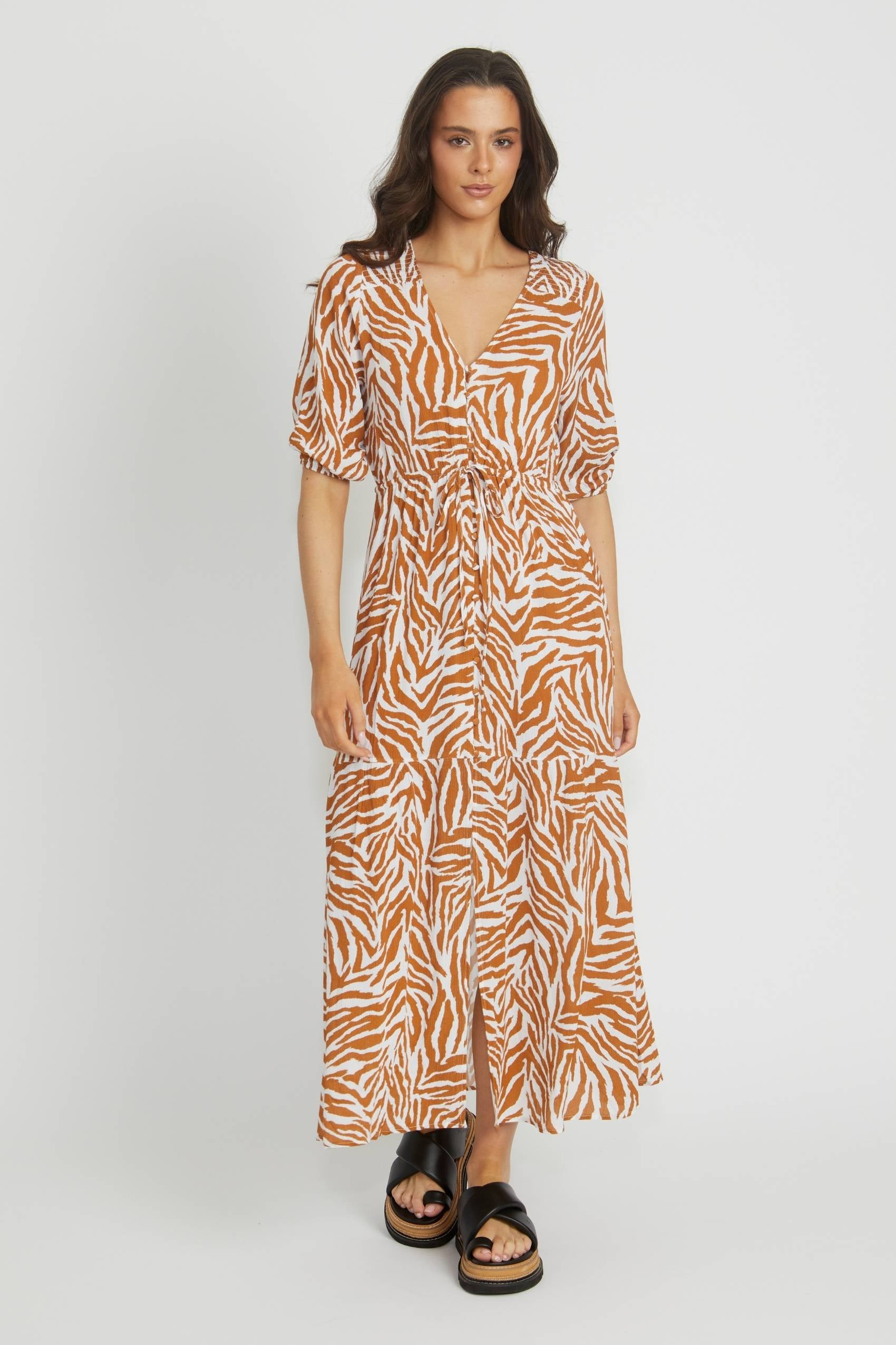 Statement-making yet easy to wear, the Mimi Dress features a daring zebra print on soft cheesecloth fabric. Its full-volume shape is balanced by a flattering V-neckline and adjustable drawstring waist.