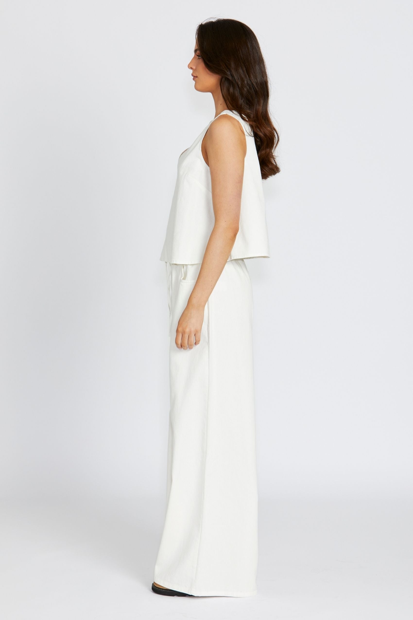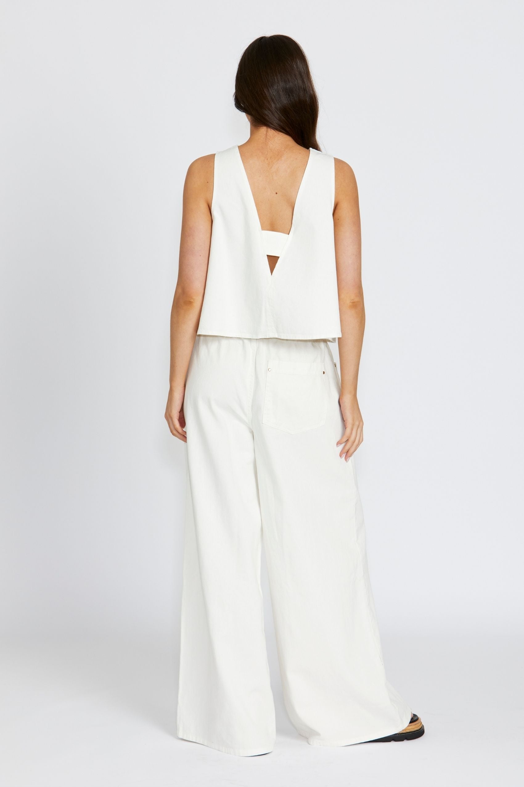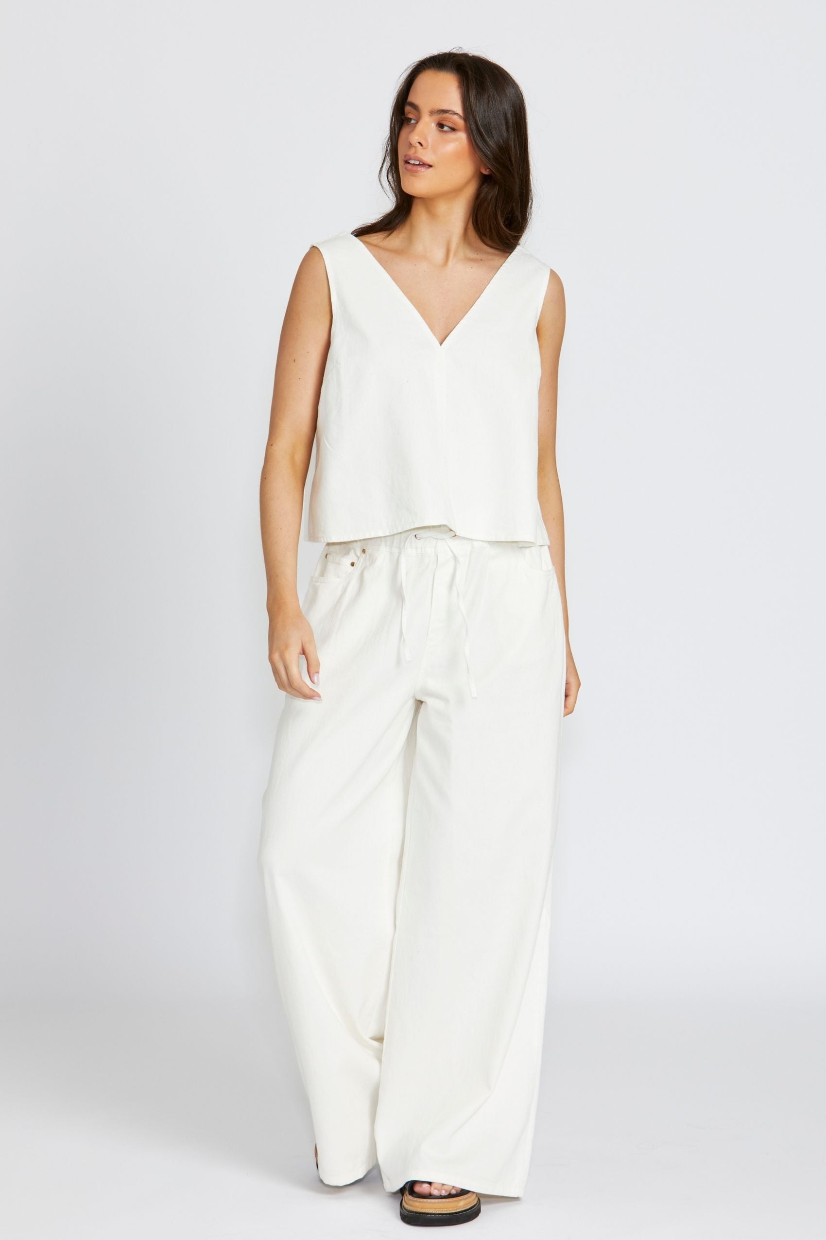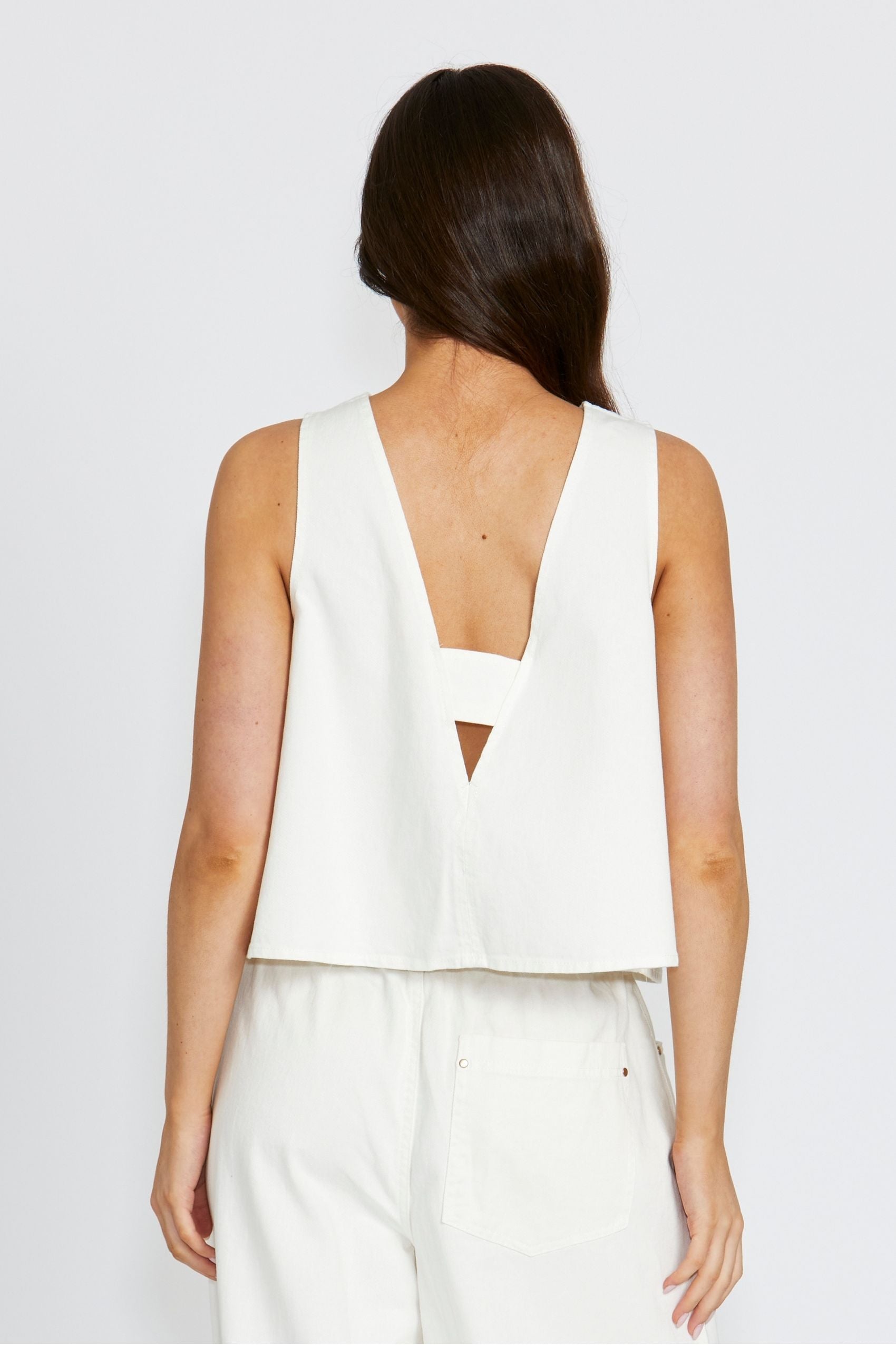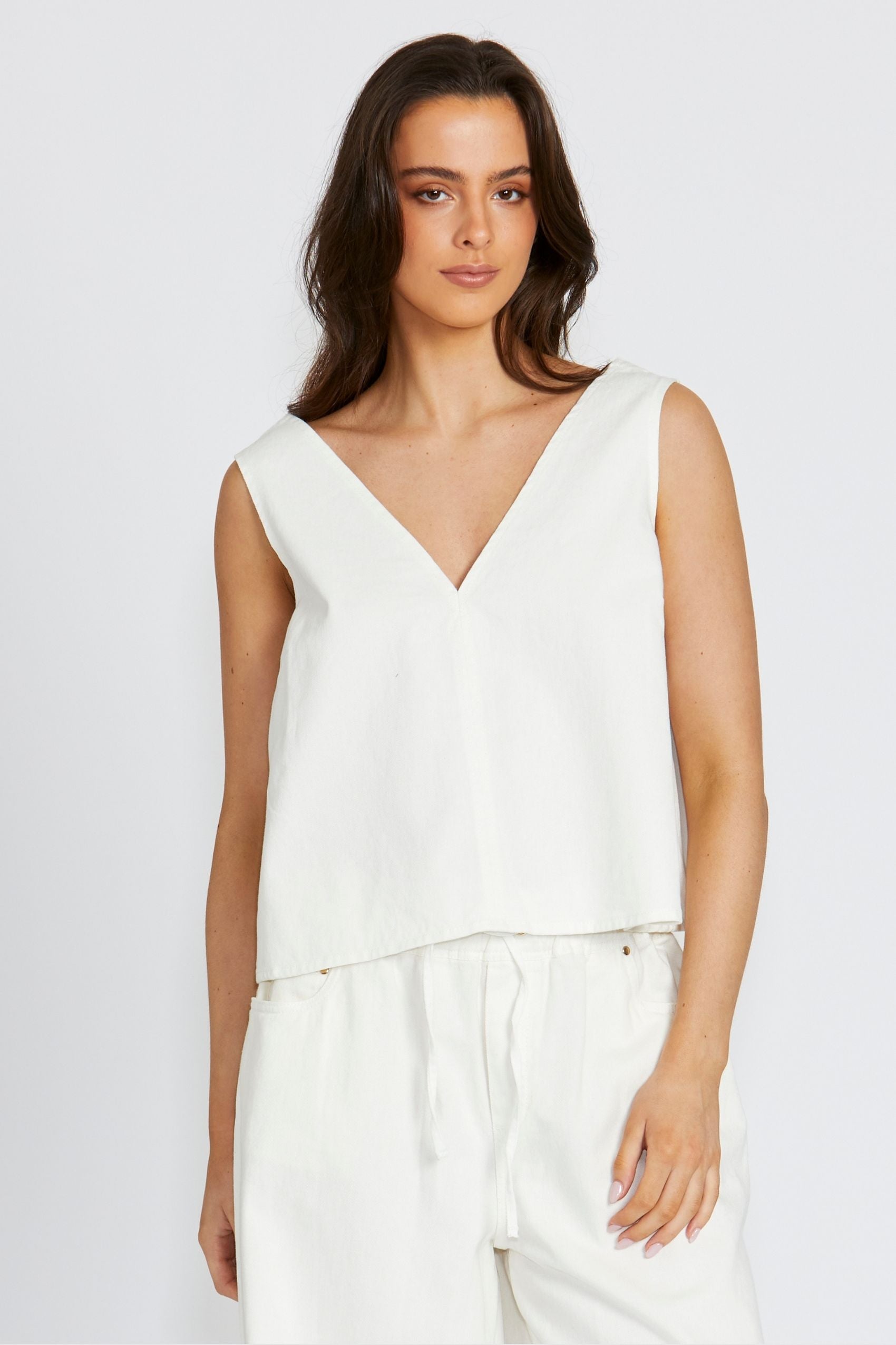 A sleeveless V-neck top in soft cotton denim with a relaxed, draped fit. The Cleo Top offers clean lines and subtle structure, making it easy to pair with skirts, shorts, or denim for a coordinated look.