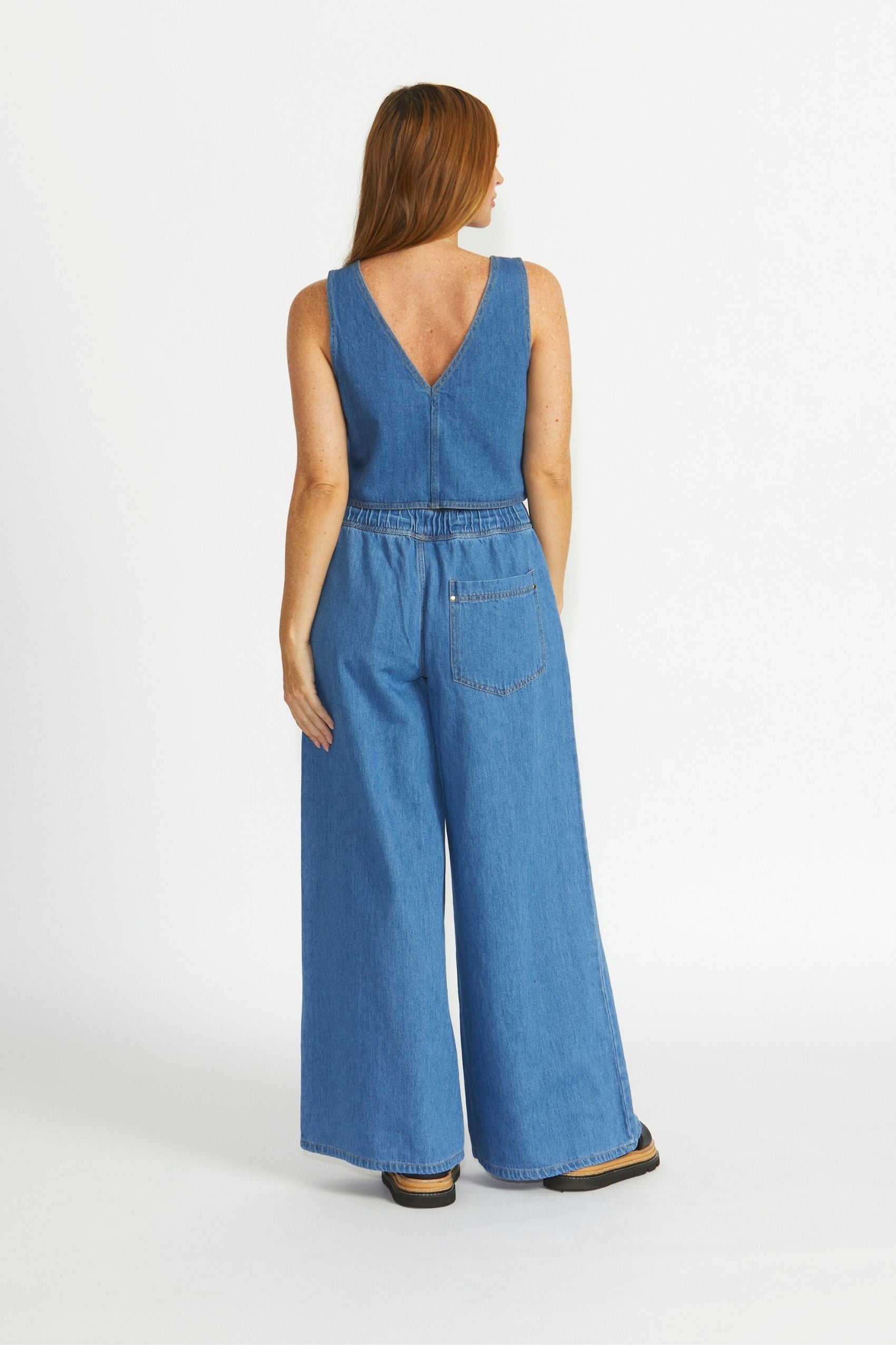 A sleeveless V-neck top in soft cotton denim with a relaxed, draped fit. The Cleo Top offers clean lines and subtle structure, making it easy to pair with skirts, shorts, or denim for a coordinated look.
