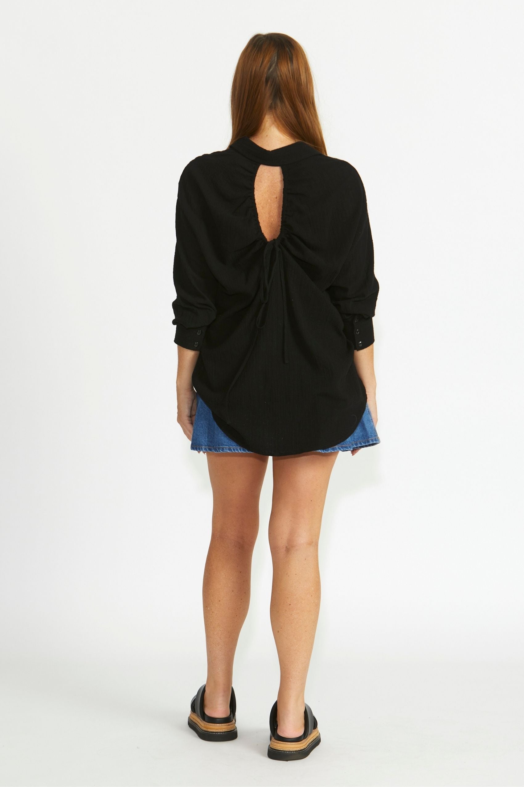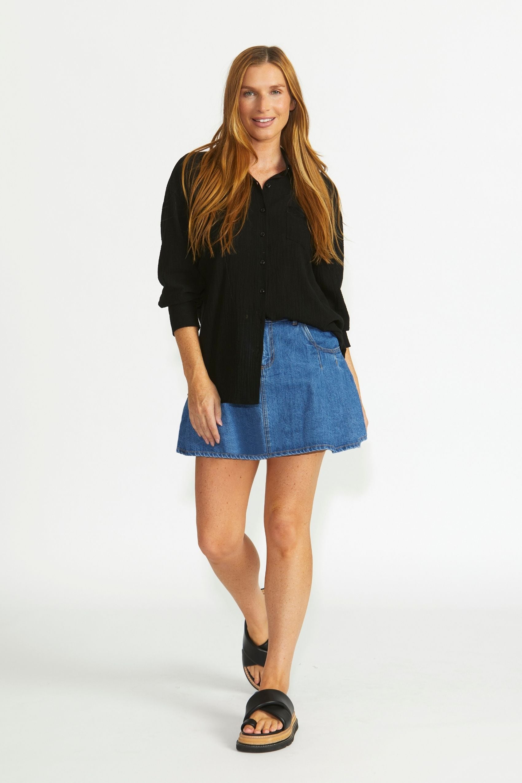 A long-sleeve button-up shirt in soft viscose crinkle, offering a fluid drape and airy comfort. The Sara Shirt works effortlessly tucked, untucked, or layered over dresses and tanks.